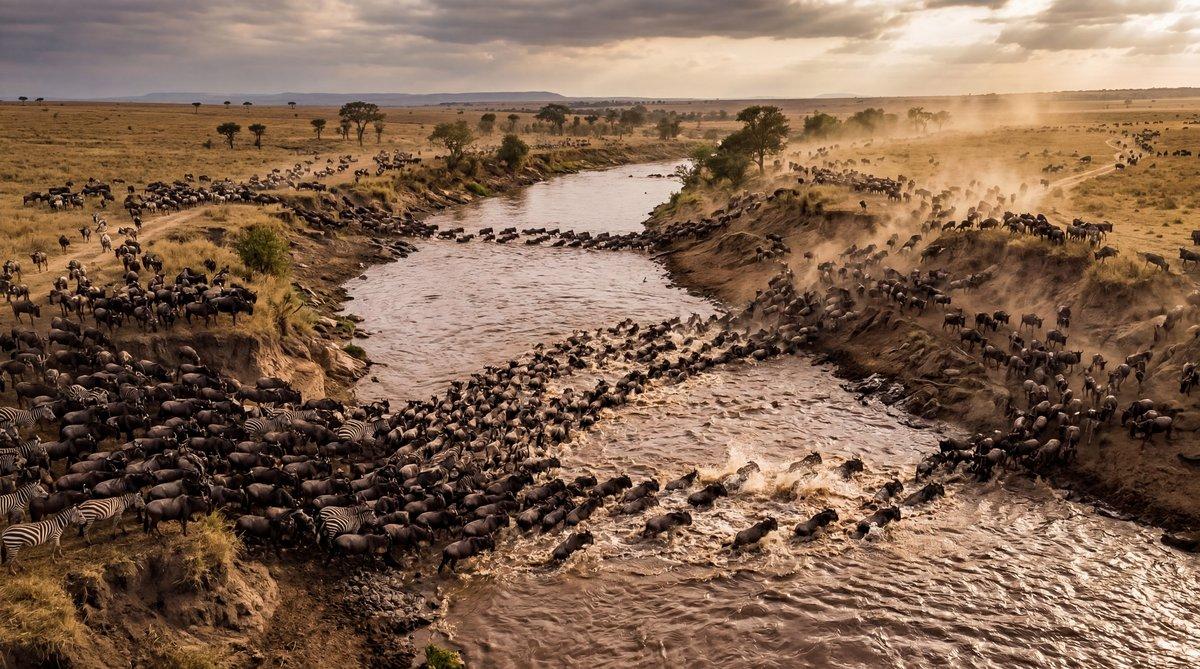 Thousands of wildebeest and zebras surge across a river during the Great Migration in the Serengeti — one of nature’s most dramatic spectacles and a highlight of any Tanzania safari.